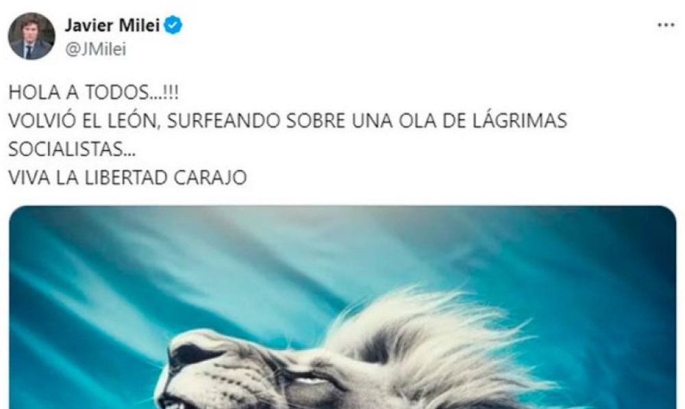 El presidente Javier Milei publicó un desafiante mensaje, en medio de la tensión diplomática con España después de haber tildado de “mujer corrupta” a Begoña Gómez, esposa de su par del país europeo Pedro Sánchez. Milei escribió en su cuenta de X: “¡Hola a todos! Volvió el león, surfeando sobre una ola de lágrimas socialistas… Viva la libertad carajo”, en su vuelta a la Argentina.