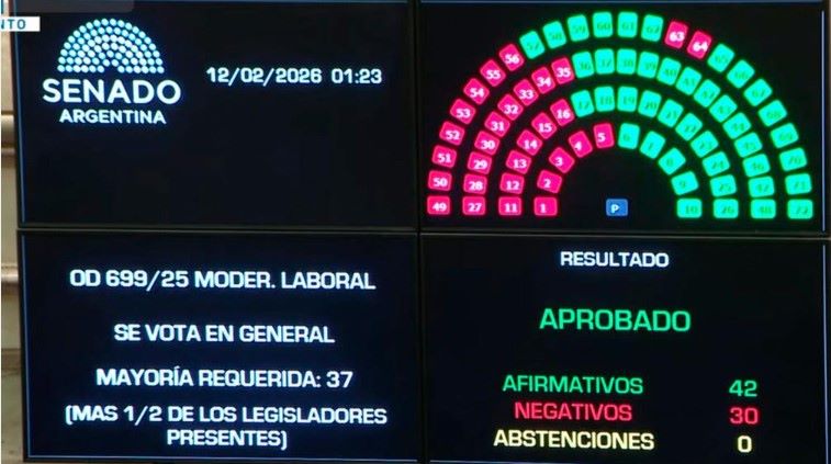Con un total de 42 votos afirmativos, el Senado aprobó la reforma laboral enviada por el Poder Ejecutivo nacional. En el palco se encontraba Karina Milei, el jefe de Gabinete, Manuel Adorni, el ministro del Interior, Diego Santilli, el titular de la Cámara de Diputados, Martín Menem, y Eduardo “Lule” Menem, quienes se presentaron en representación del presidente Javier Milei.