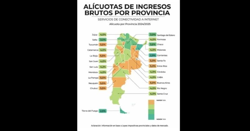 Solo Corrientes con el 2,9% y Tierra del Fuego con 2,5%, reflejan una tasa menor y Salta una alícuota igual a la de Santiago del 3%. Todo el resto de las provincias cobran Ingresos Brutos con alícuotas mayores a las que aplica Santiago del Estero por ejemplo en un rubro clave como lo es el servicio de conectividad a internet.