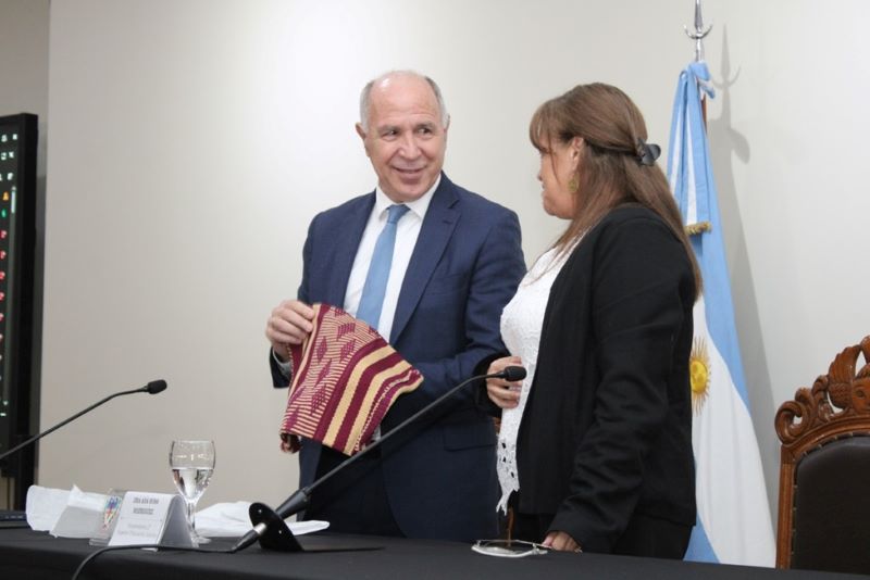 Antes de comenzar la conferencia, la magistrada hizo entrega al visitante de un presente, en nombre del Centro Único de Capacitación del Poder Judicial, organismo del que es vocal supervisora y que organizó esta actividad académica.